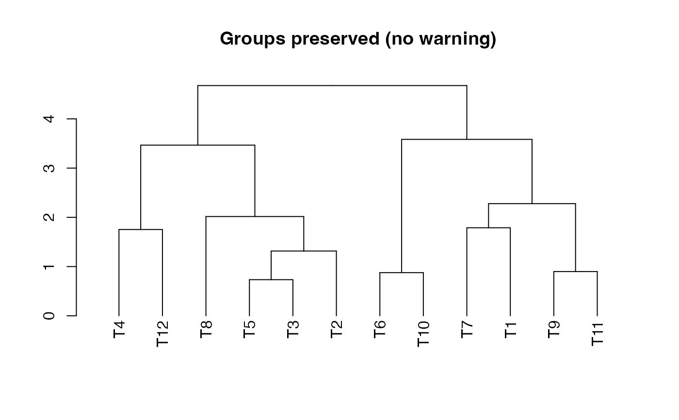 plot(dend_preserved, main = "Groups preserved (no warning)")